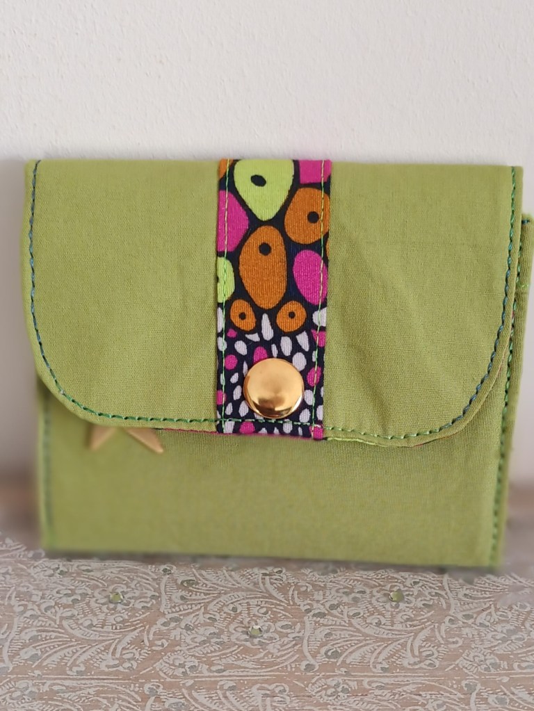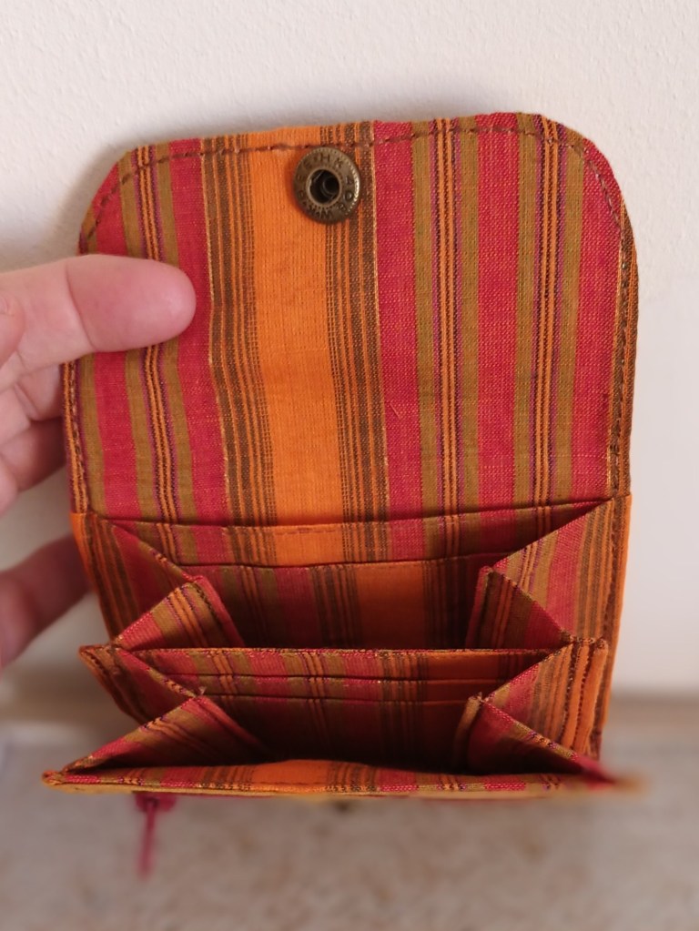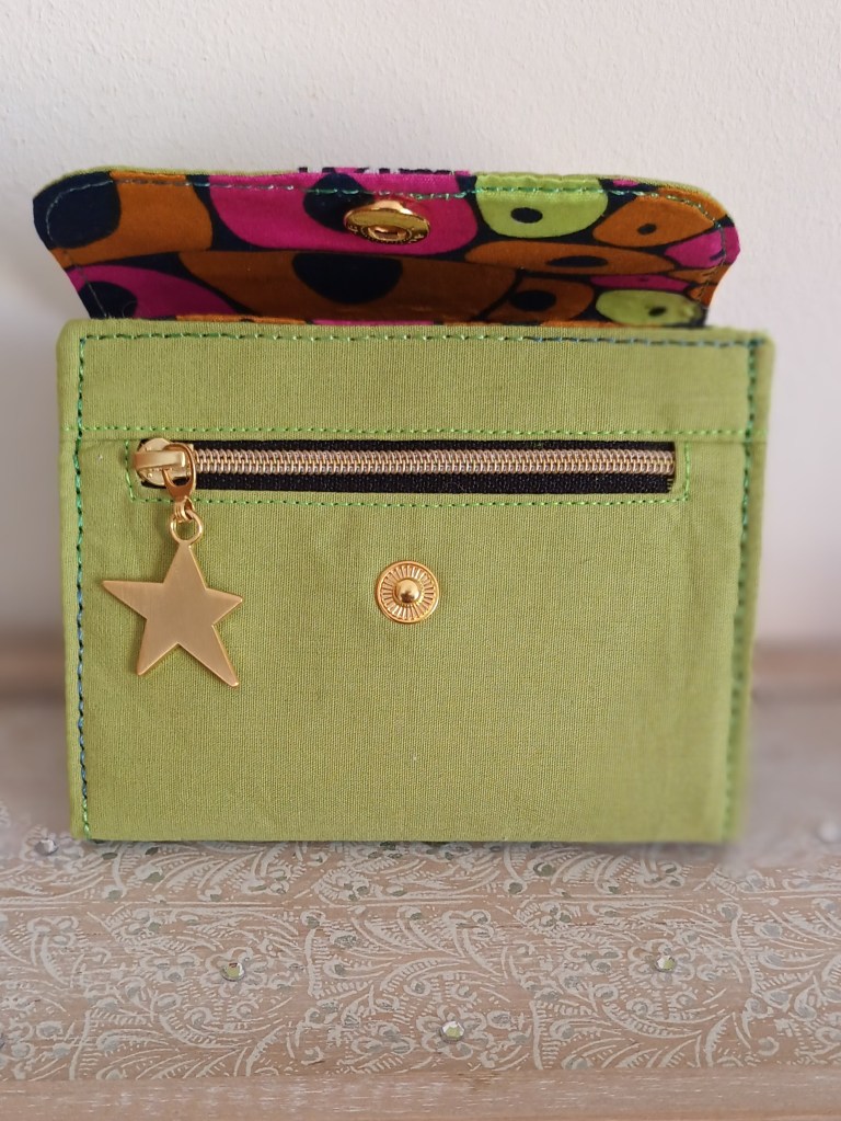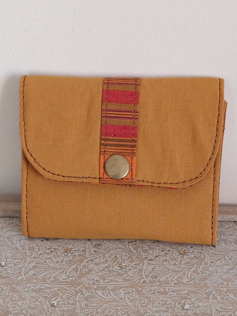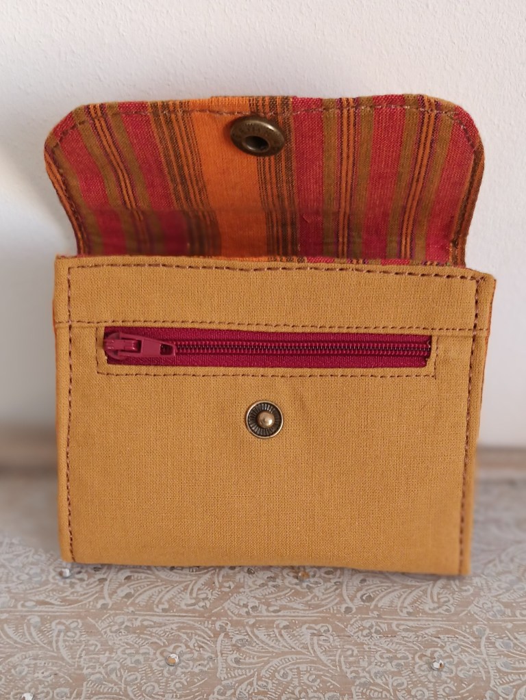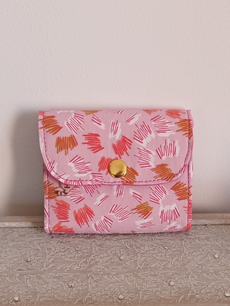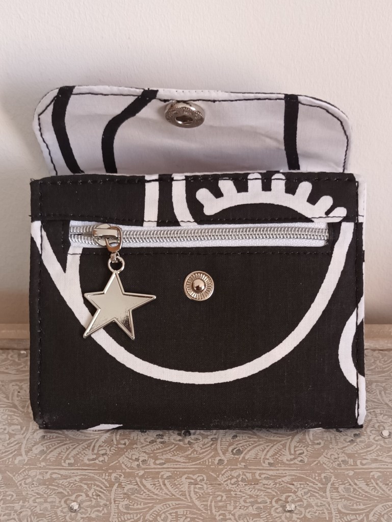 Porte-monnaie: Un porte-monnaie simple, pratique, petit, à glisser partout. 10 cm de haut par 10 cm de large, il se ferme par une pression et a trois compartiments à l’intérieur (monnaie, billets, cartes). J’aurai pu le nommer le 10×10 car en plus, il ne coûte que 10 €!