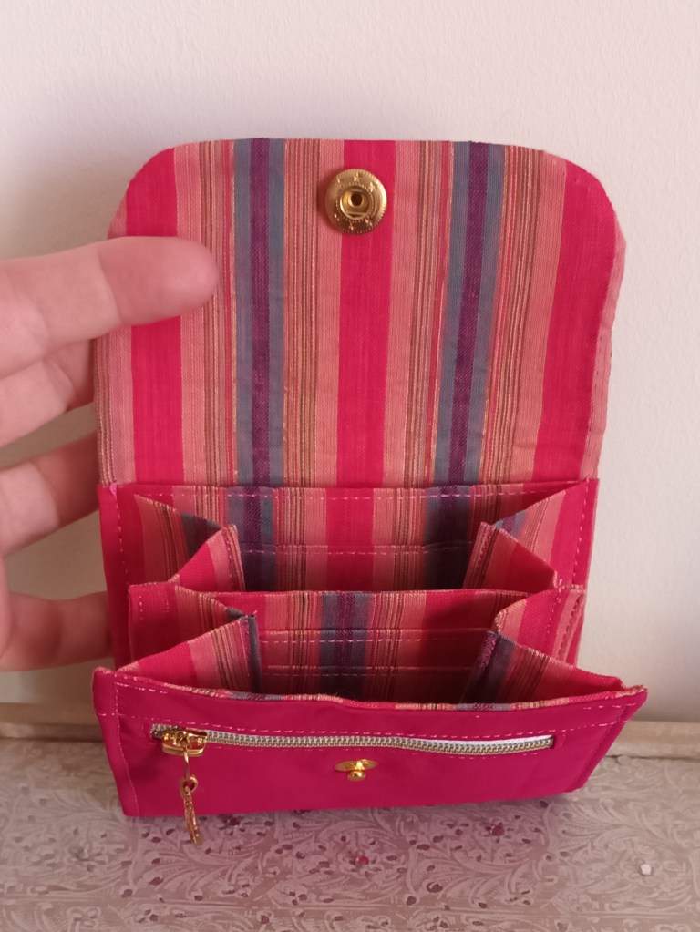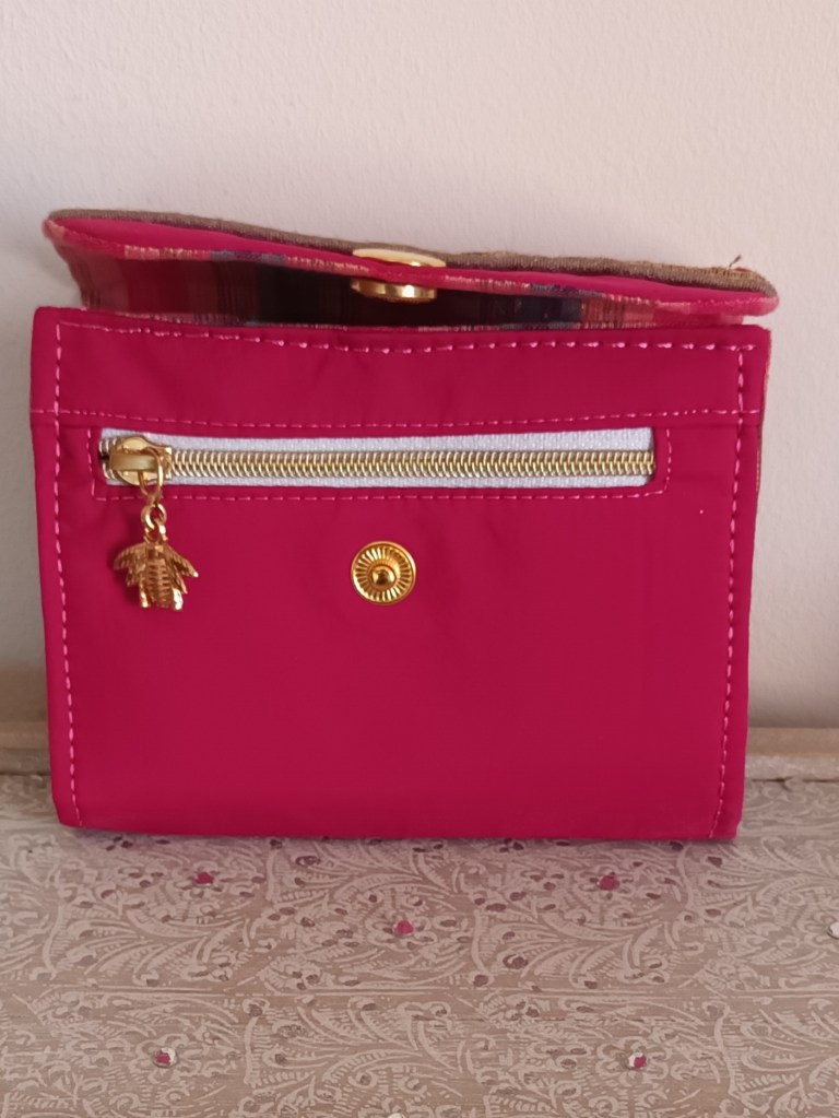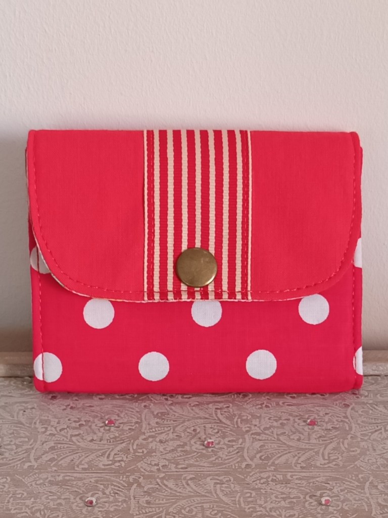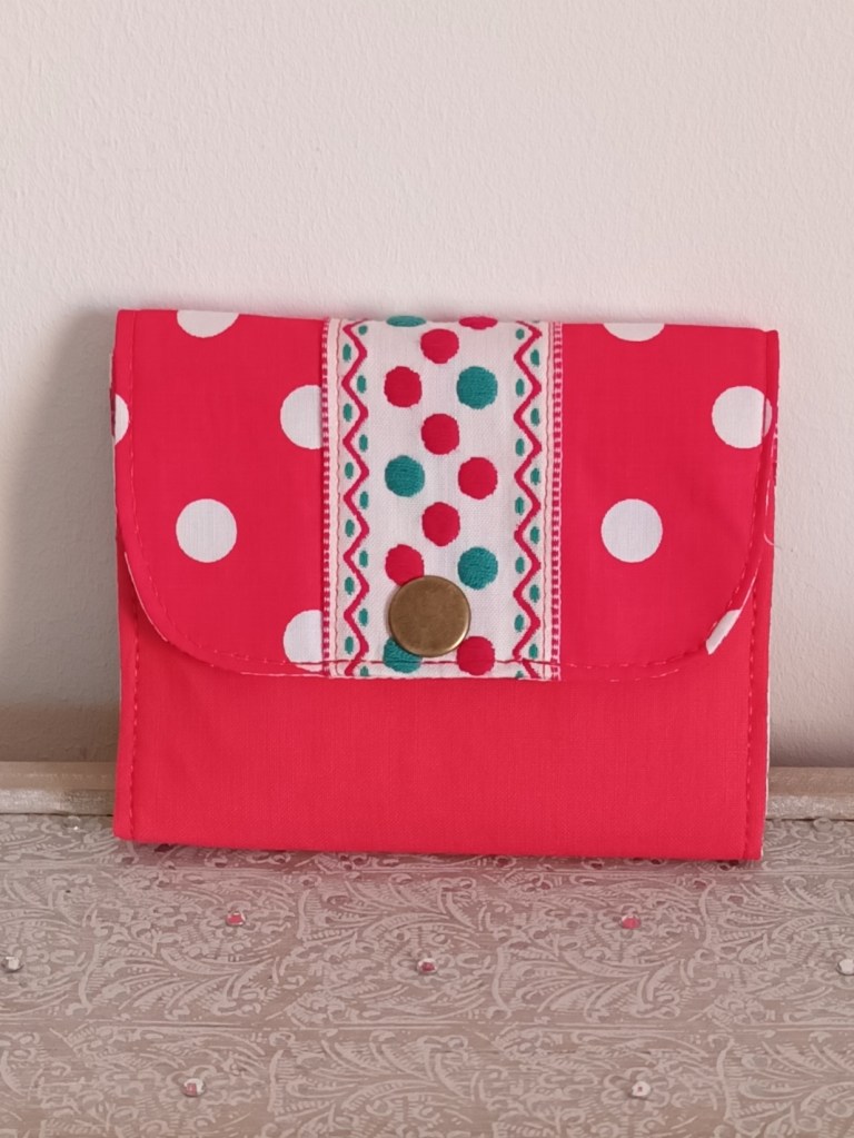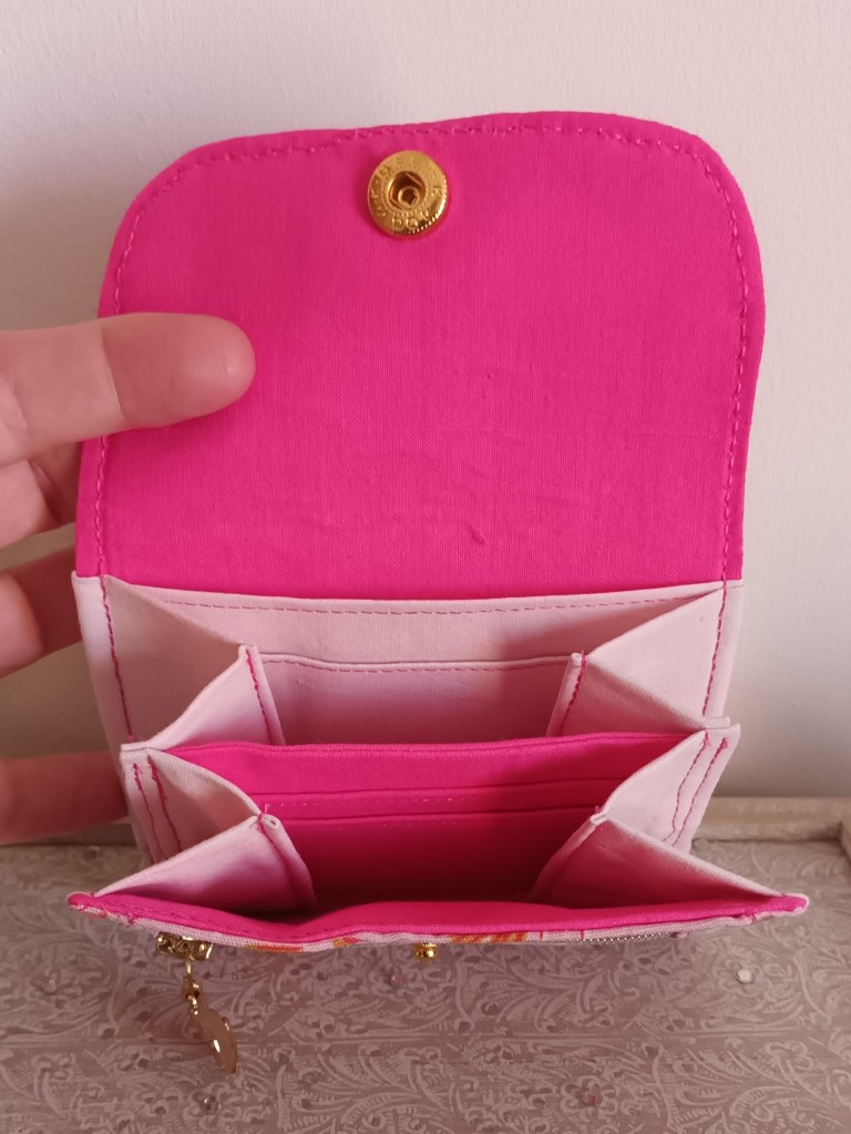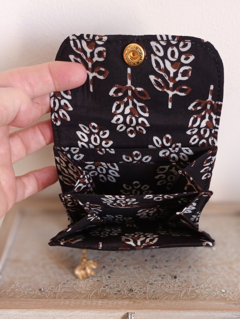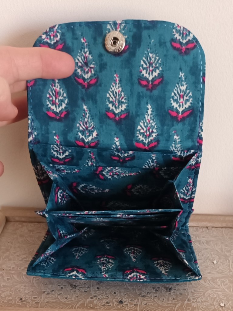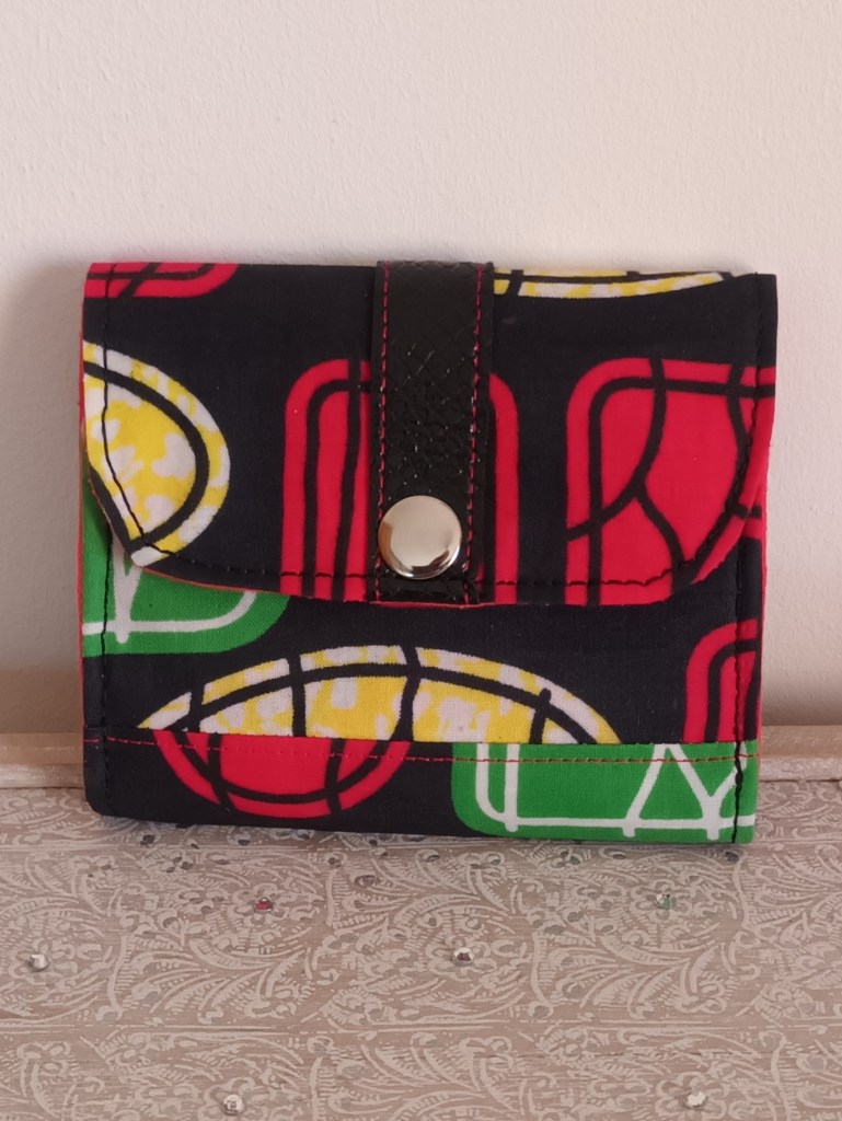 Porte-monnaie: Un porte-monnaie simple, pratique, petit, à glisser partout. 10 cm de haut par 10 cm de large, il se ferme par une pression et a trois compartiments à l’intérieur (monnaie, billets, cartes). J’aurai pu le nommer le 10×10 car en plus, il ne coûte que 10 €!