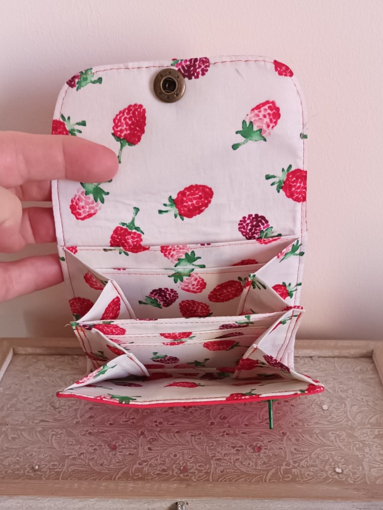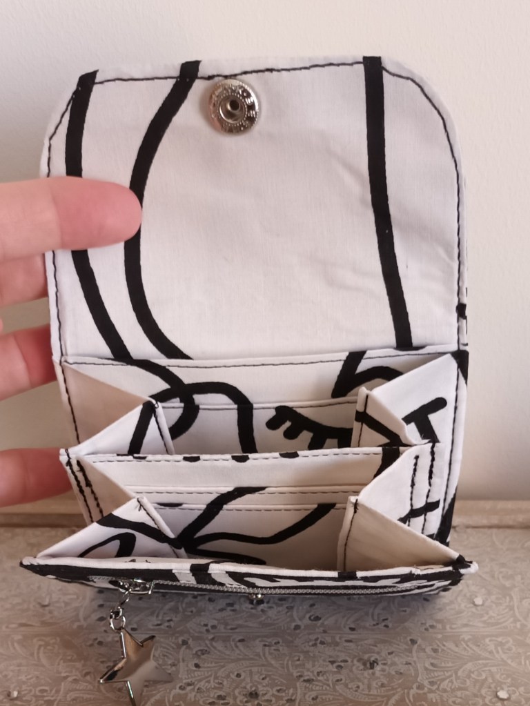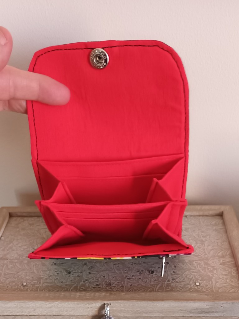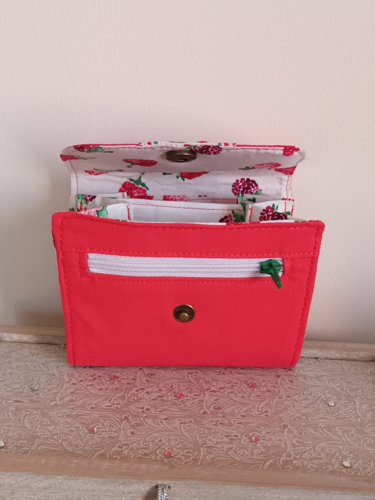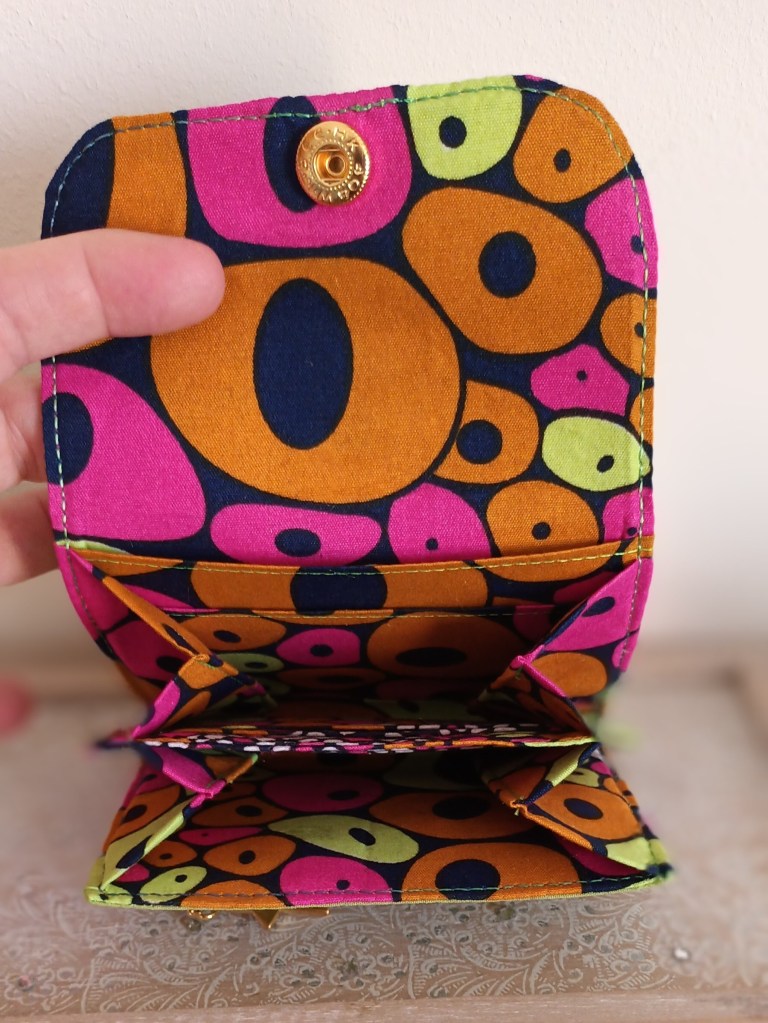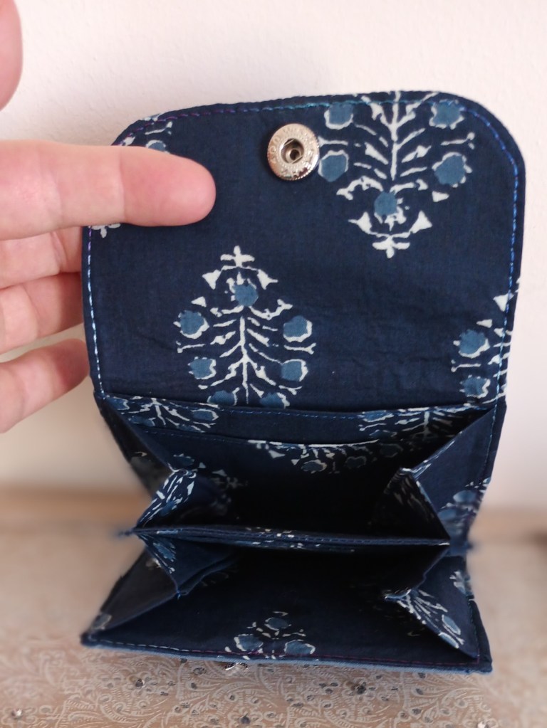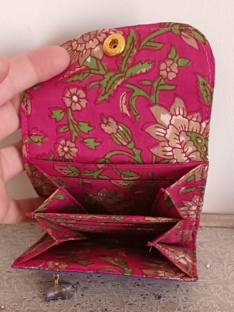 Porte-monnaie: Un porte-monnaie simple, pratique, petit, à glisser partout. 10 cm de haut par 10 cm de large, il se ferme par une pression et a trois compartiments à l’intérieur (monnaie, billets, cartes). J’aurai pu le nommer le 10×10 car en plus, il ne coûte que 10 €!