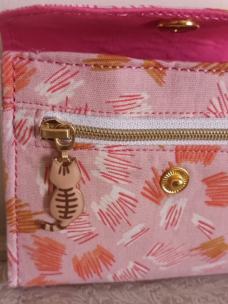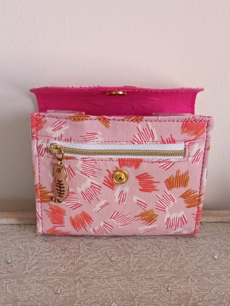 Extérieur: coton rose imprimé, fermeture par pression dorée. Porte-monnaie : zip doré avec breloque chat. Intérieur: coton uni rose foncé et rose pâle.