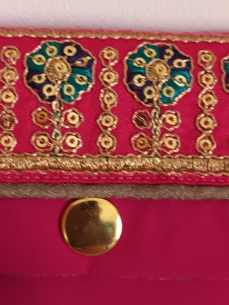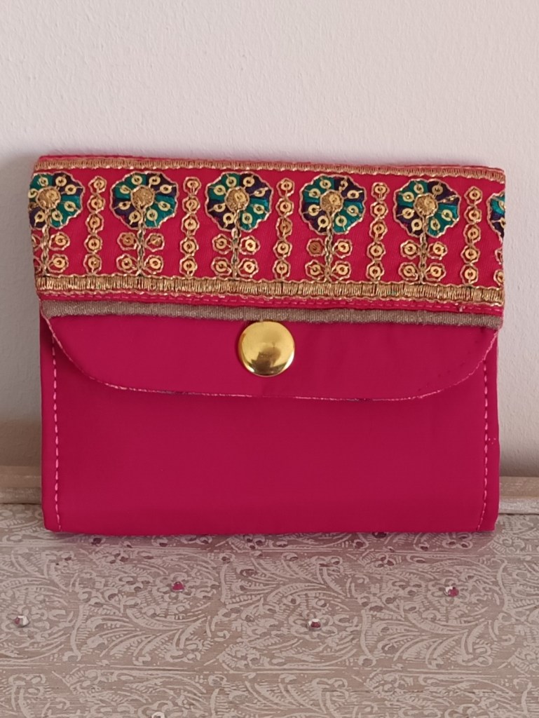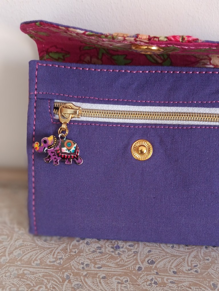 Extérieur: coton avec application ruban indien, fermeture par pression dorée. Porte-monnaie : zip doré avec breloque éléphant indien Intérieur: coton indien artisanal imprimé main rose fleuri