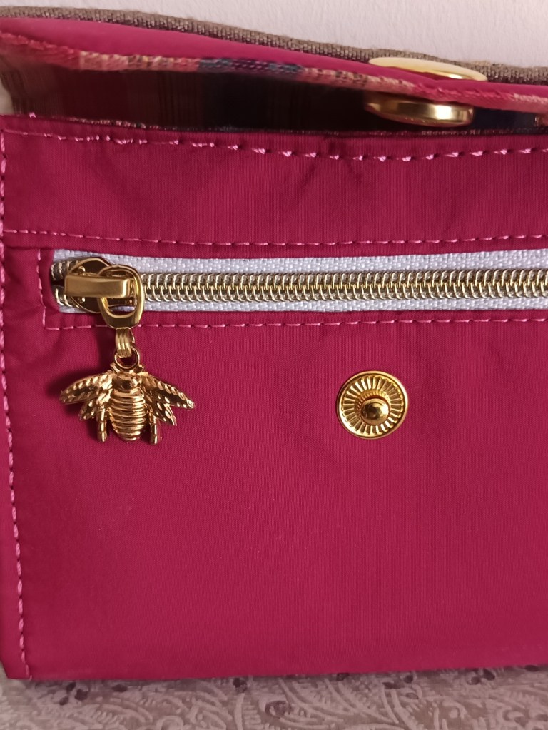 Extérieur: toile parachute rose fuchsia avec ruban indien appliqué, fermeture par pression dorée. Porte-monnaie: zip doré avec breloque abeille dorée. Intérieur: coton indien artisanal à rayures avec fil doré.