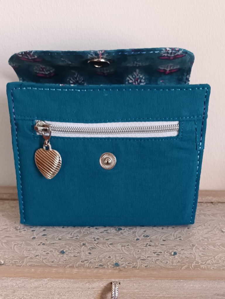 Extérieur: coton bleu pétrole, fermeture par pression argent. Porte-monnaie: zip argent avec breloque cœur argent. Intérieur: coton indien artisanal à motifs floraux fond bleu.