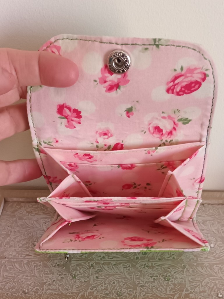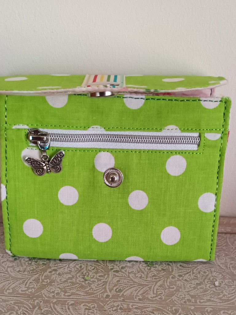 Extérieur: coton imprimé vert à pois blanc, application ruban à rayures, fermeture par pression argent. Porte-monnaie : zip argent avec breloque papillon argenté. Intérieur: coton imprimé roses .