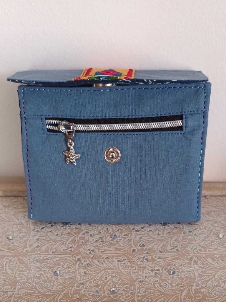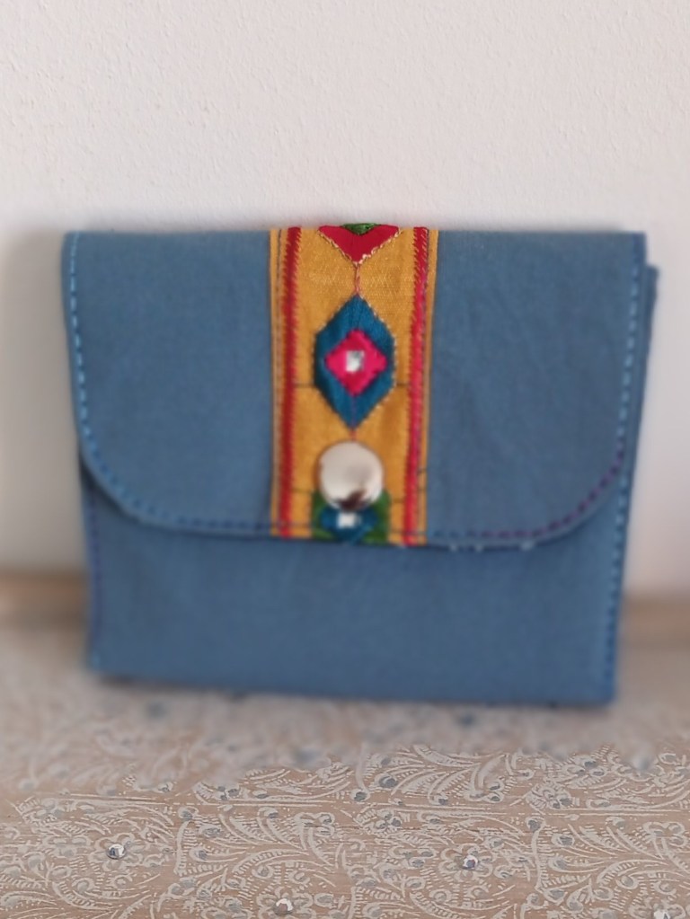 Extérieur: Coton bleu , application ruban indien, fermeture par pression argent. Porte-monnaie: zip argent avec breloque étoile. Intérieur: coton indien artisanal bleu foncé à motifs végétaux.