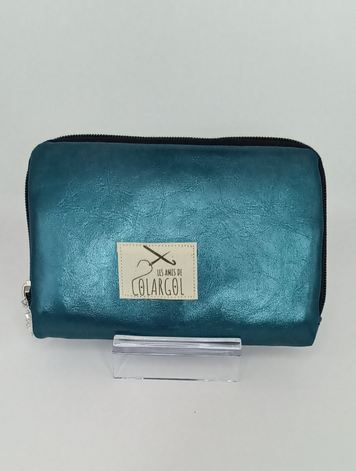 12 emplacements pour cartes(visite, bancaire, fidélité..), 2 autres un peu plus grands, 4 grandes poches ,1 emplacement chéquier et 1 porte-monnaie.